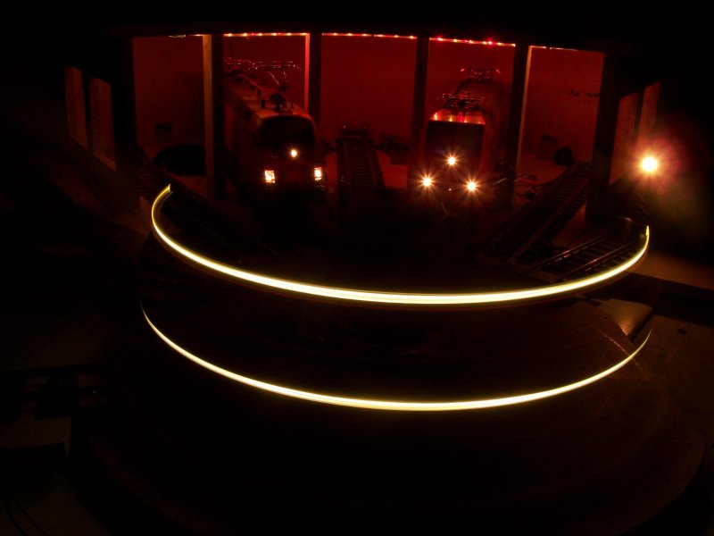 Nachtaufnahme meiner Modellbahn. Zusehen ist 182 001 (links im Lokschuppen) und 101 024 (rechts im Lokschuppen). Eine kleine Tour im Kreis unternimmt meine 218 276 (auf der Drehscheibe). Aufgenommen auf Etage 2 meiner Modellbahn.