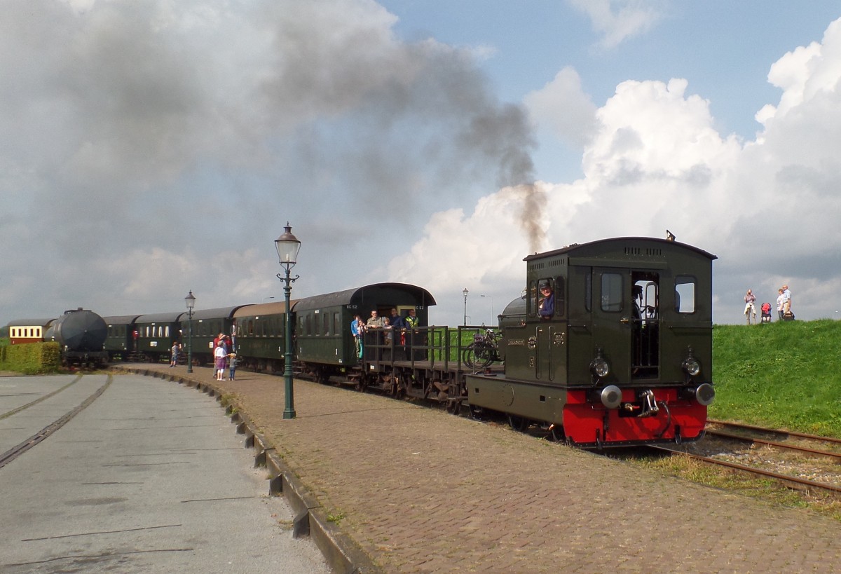 Lok SHM 26 P.H. BOSBOOM am 7.9.2014 vor dem Zug aus Hoorn in Medemblick einfahrend / Regelspur, Lüp 6,73 m, Gewicht 28,5 t,