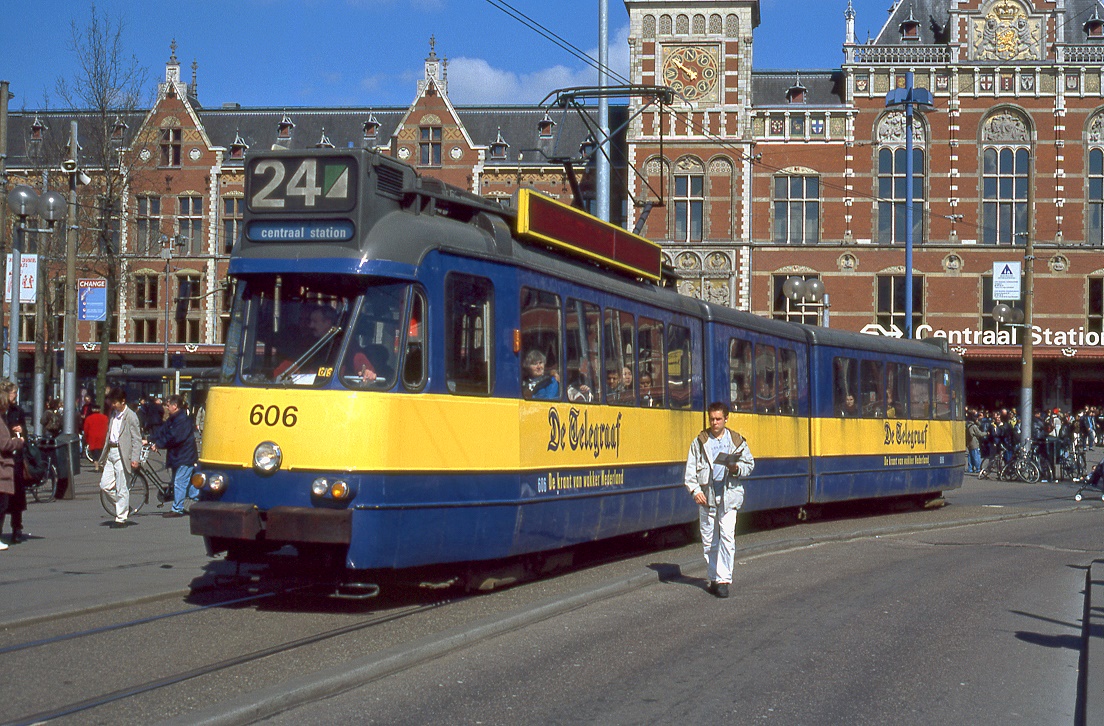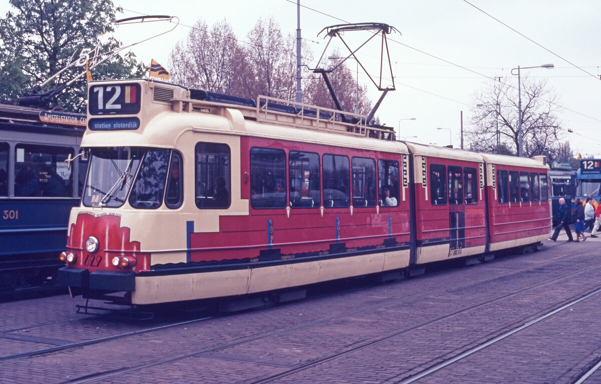 GVB 629 am Bf Amsterdam Amstel am 22.04.1989, Linie 12. Wagen in speziallackierung "Oostenrijkse School". Scanbild 4894, Agfachrome CT100. Rob Freriks