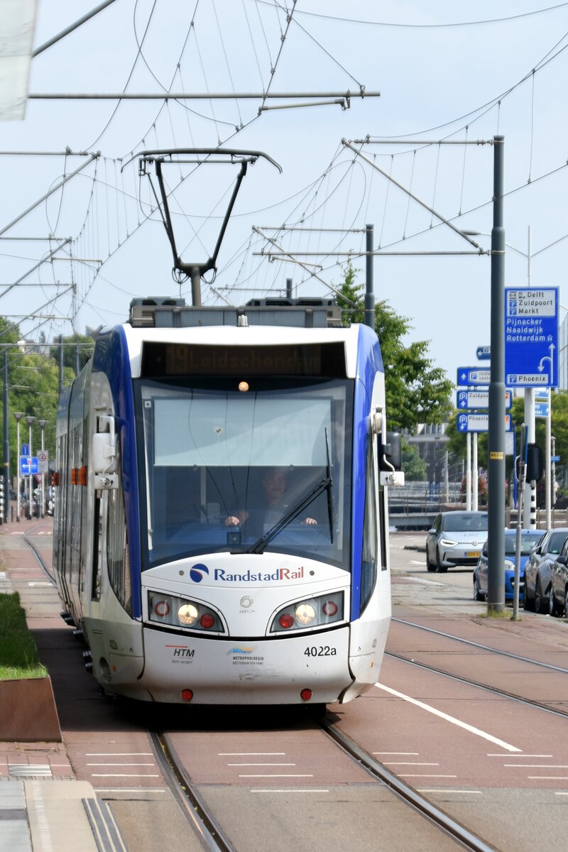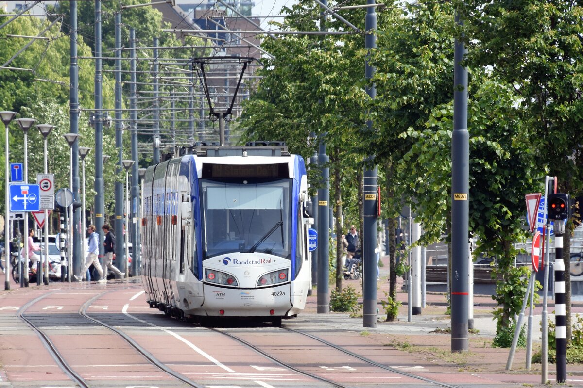 DELFT (Provinz Zuid-Holland), 01.06.2025, die Stadt ist an das Straßenbahnnetz der Stadt Den Haag angebunden; Straßenbahnzug 4022a als Straßenbahnlinie 19 nach Leidschendam bei der Einfahrt in die Haltestelle Prinsenhof
