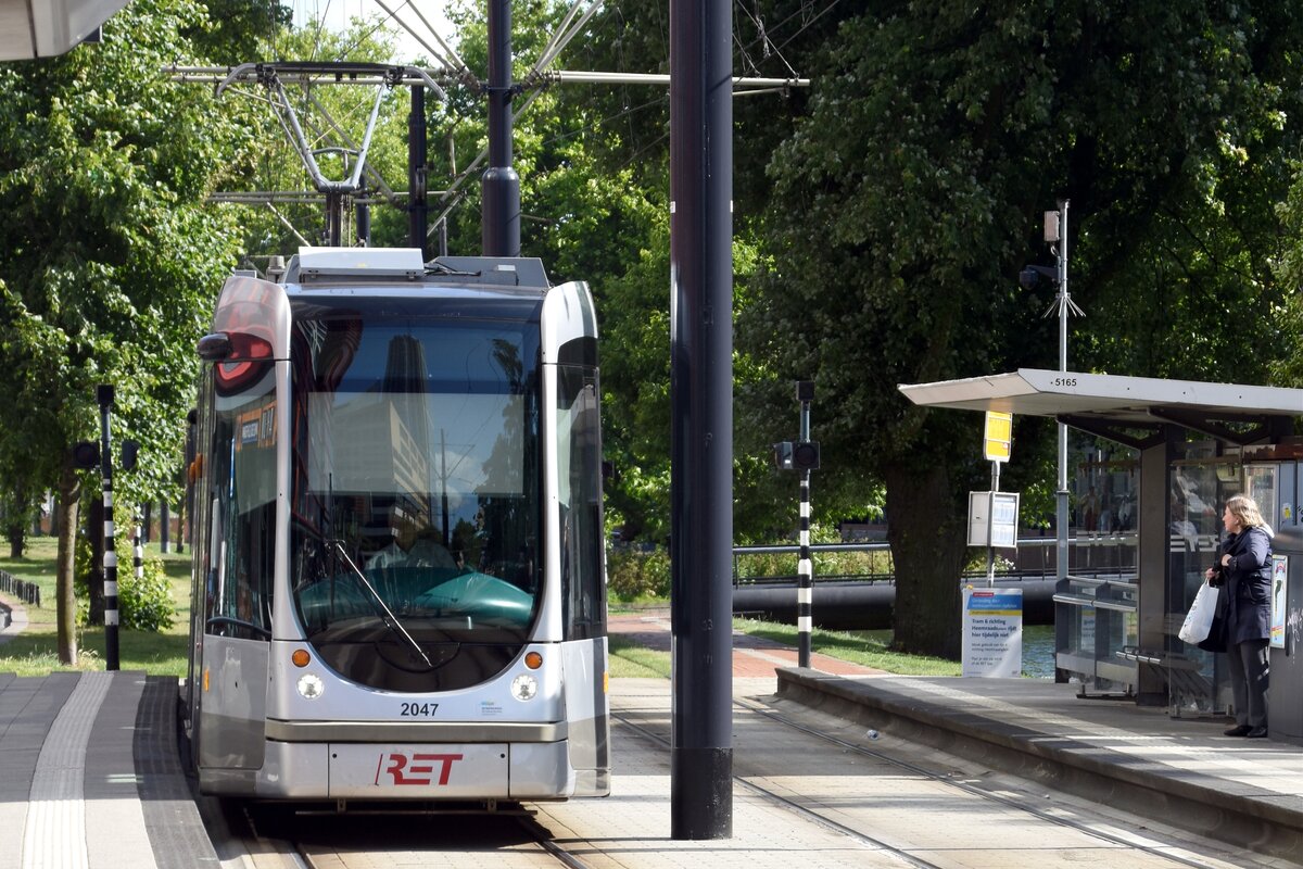 ROTTERDAM (Provinz Zuid-Holland), 02.06.2025, Straßenbahnzug 2047 als Straßenbahnlinie 5 nach Rotterdam Centraal bei der Einfahrt in die Haltestelle Kruisplein
