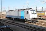 Am trüben 18 März 2017 treft Captrain 186 296 mit der Bottropper Kohlezug in Venlo ein und passiert der Fotografentruppe an der heute gesperrter Bahnübergang bei Venlo-Vierpaardjes. Leonardus Schrijvers