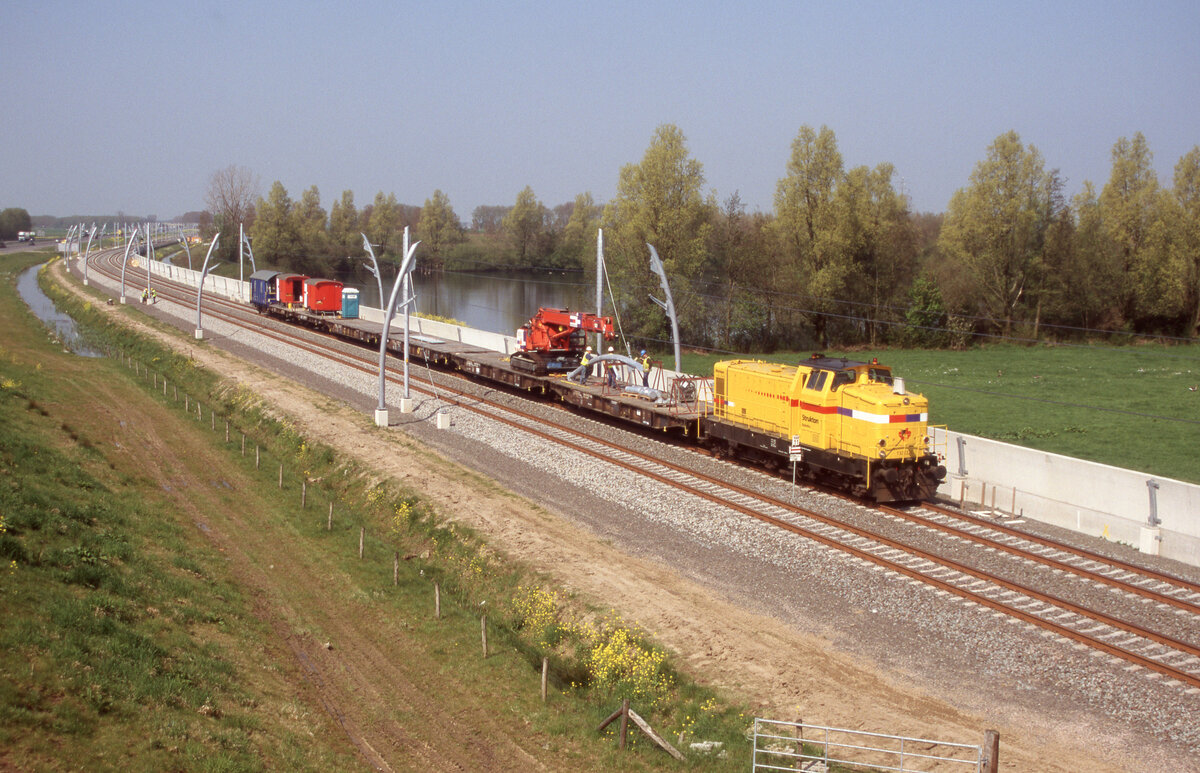 Bauzug für Oberleitungsarbeiten bei Opheusden, an der Güterstrecke wurde noch gebaut. Es führt Strukton 1322321 (später 303004).Scanbild 9019, Fujichrome100. 22.04.2005. Rob Freriks