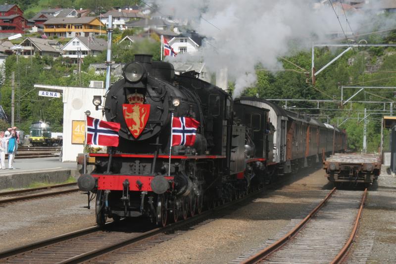 Nach vier Tagen Fahrt mit vielen Feierlichkeiten steht der Jubiläumszug kurz vor seinem Ziel zur Präsentation im Bahnhof Indre Arna; 07.06.2009 André Breutel