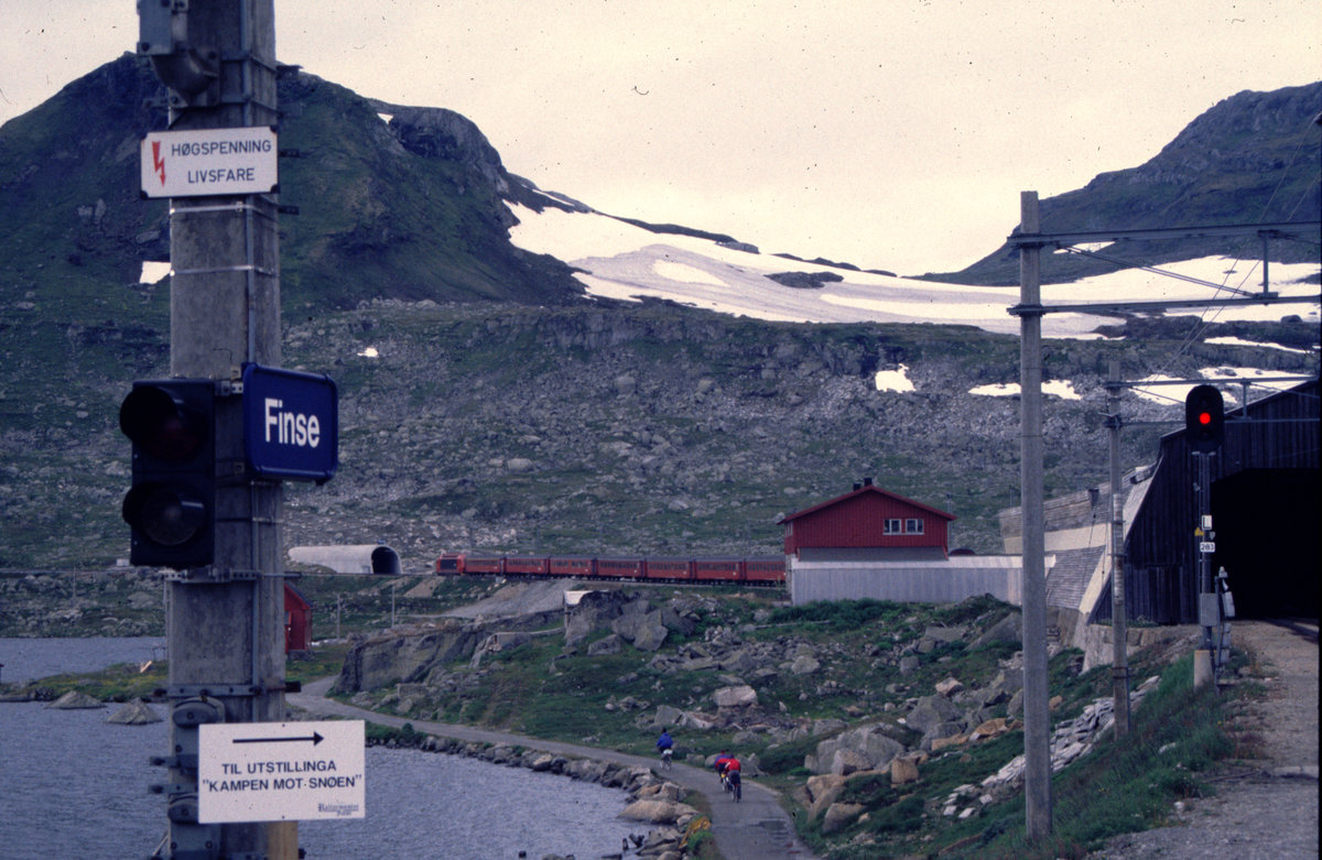 Die NSB El 18 2251 pausiert mit einem Reisezug im 1222,2 m hoch gelegenen Bahnhof Finse. (August 1998, Scan vom Farbdia)