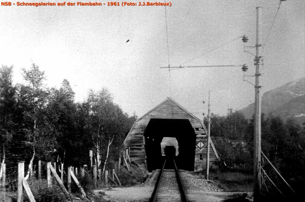 NSB - Wieder die Flambahn im Sommer 1961.  Die Schneegalerien sind natürlich nur während dem Winter nötig. Foto: J.J. Barbieux