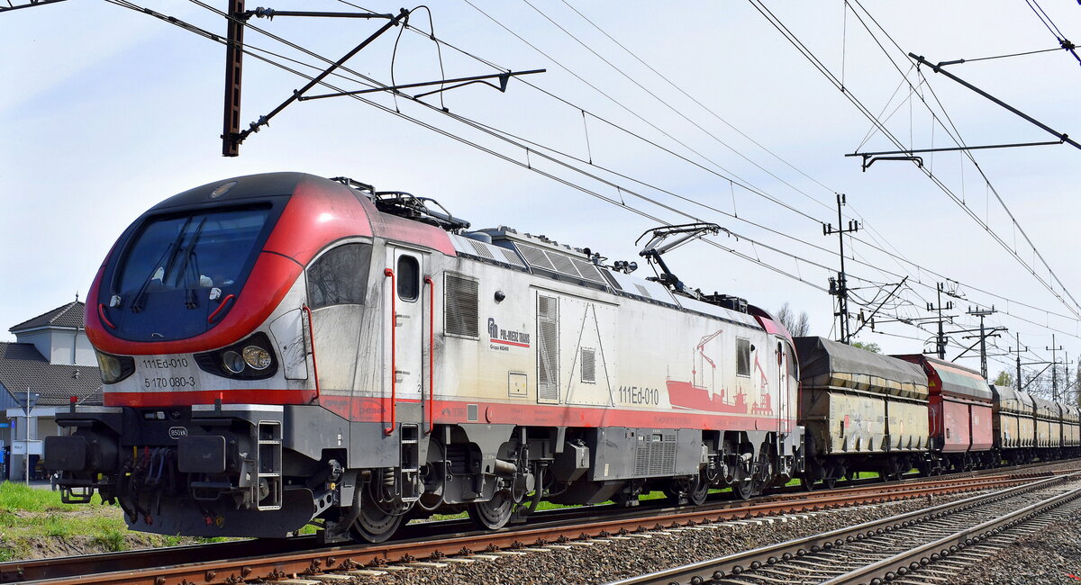 PMT - Pol-Miedź Trans Sp. z o.o., Lubin [PL] mit der angemieteten Cargounit Gama Lok "111Eb-003" [NVR-Nummer: 91 51 5170 065-4 PL-ID] und einem Kesselwagenzug (Schwefelsäure) am 14.07.23 Höhe Bahnhof Kostrzyn nad Odrą.
