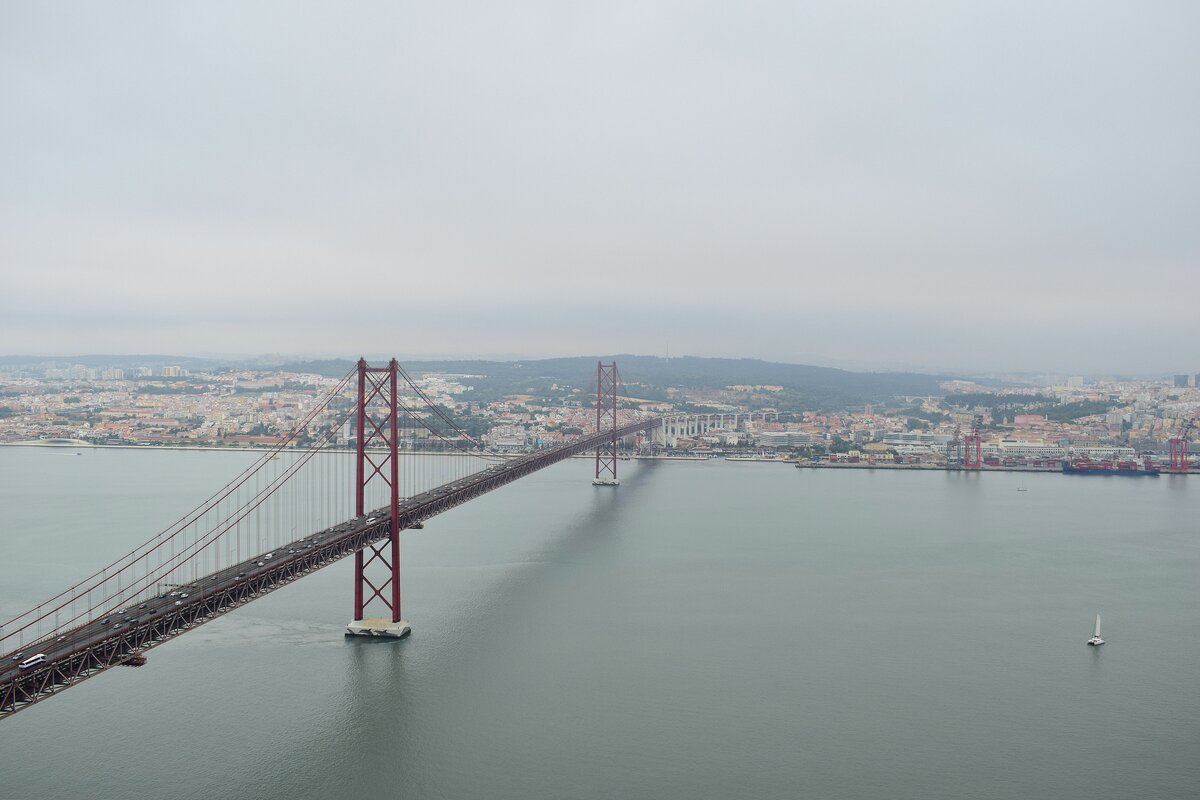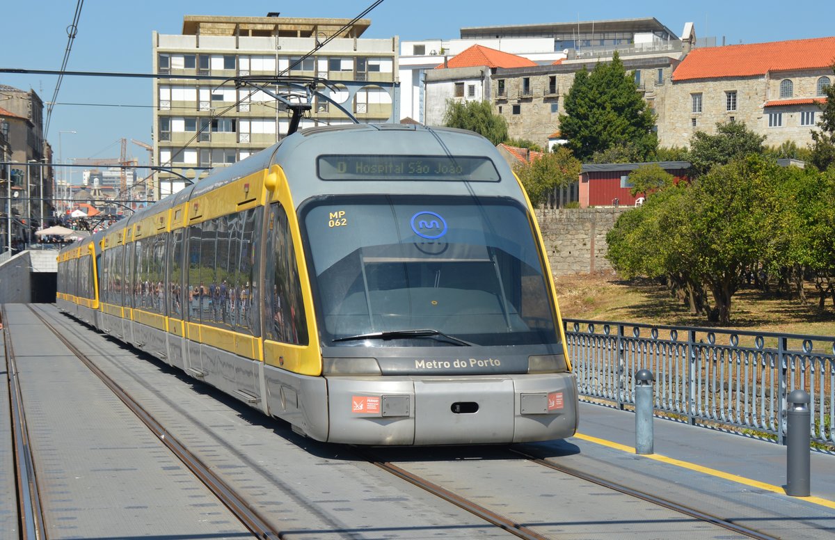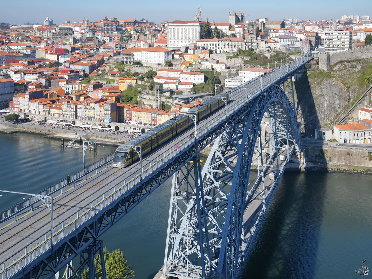 Ein Fahrzeugduo der Metro befährt Mitte Januar 2017 die Brücke Ponte Luis I. in Porto, welche über den Fluss Douro führt.