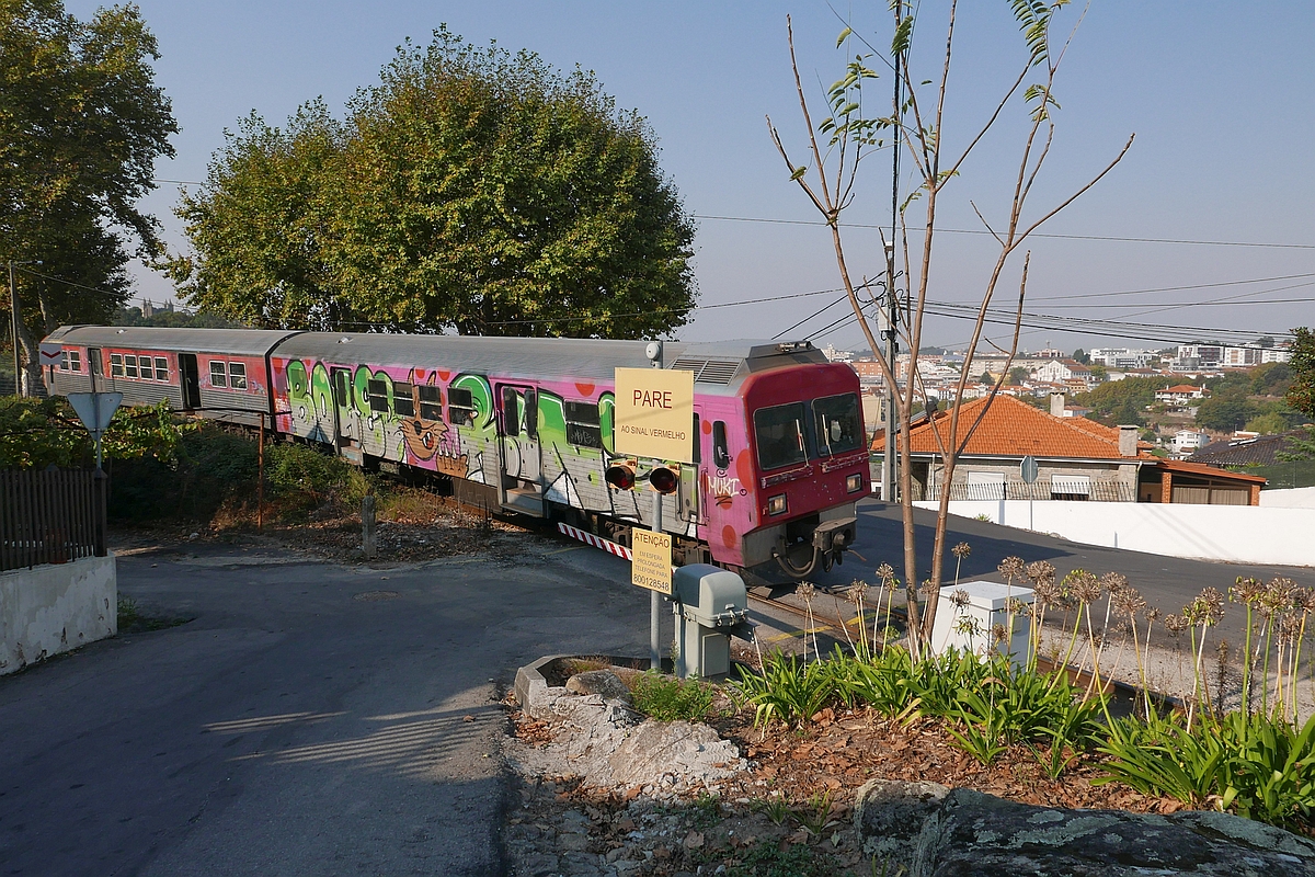 1955 lieferte Allan in Rotterdam zehn dieselelektrische Triebwagen der BR 9300 an die CP. Die Fahrzeuge haben die rundlichen Formen der 1950-er Jahre, wie wir sie z.B. vom VT08 und ETA 175 kennen. Ursprünglich waren die Wagen dunkelblau mit dunkelroten Zierstreifen. Das Bild zeigt Triebwagen 9308 in Sernada do Vouga (17. Mai 1988).