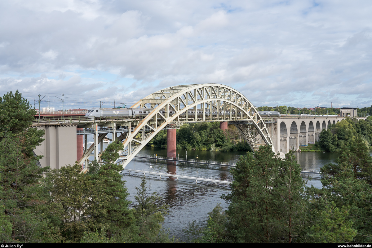 Green Cargo Rc4 1266 am 5. September 2019 mit einem Kurzgüterzug auf der Årstabron in Stockholm.