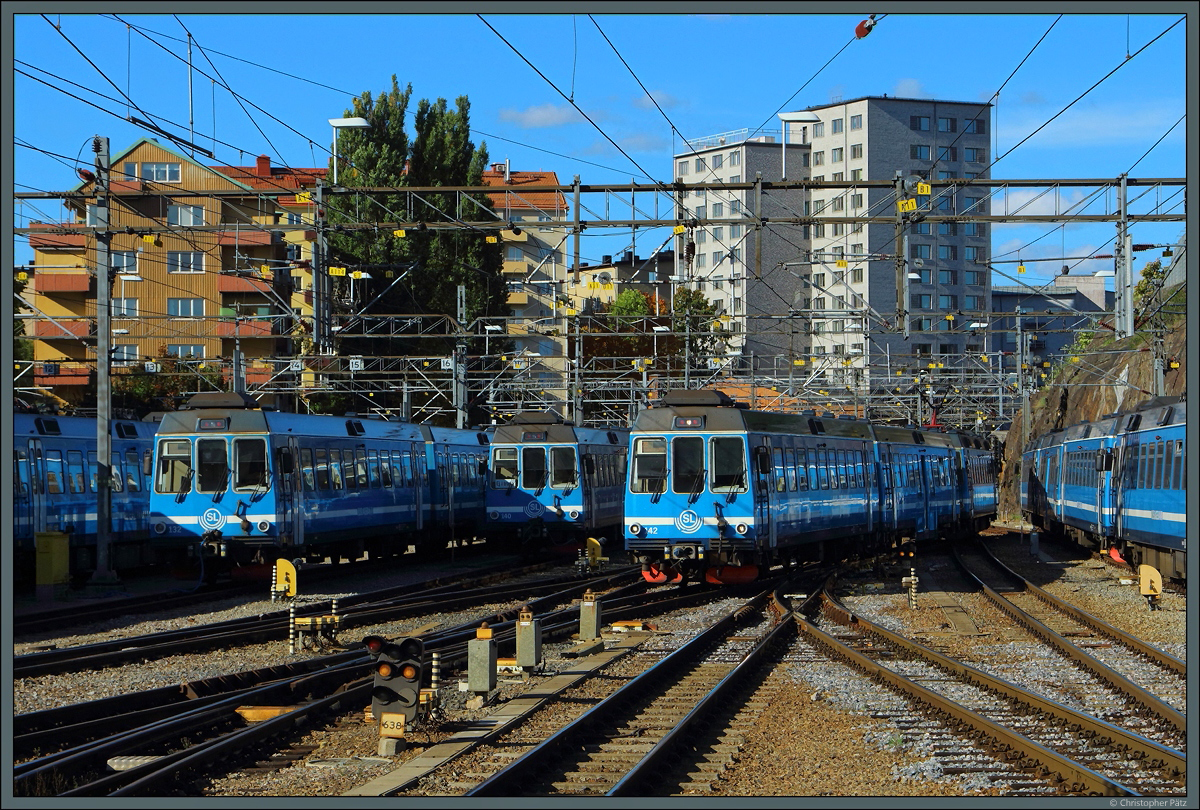 Dieser Zug, mit zwei XP 7 Motorwagen und einem Beiwagen inzwischen, wartet für einen neuen Dienst in Stockholm Östra (Ostbahnhof). Dieser Netz (Spurweit 891 mm) war früher sehr gross : bis Uppsala, Hallstavik und Norrtälje aber nur teilweiser elektrifiziert. Es bleibt nur zwei Linien, mit modernen Material.