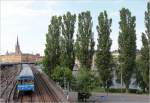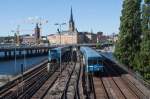 Nach einem kräftigen Regenguss bildet sich am 17.05.2023 im Licht der Abendsonne ein Regenbogen über der Stockholmer Altstadt. Auf der Brücke über den Riddarfjärden begegnen sich ein Doppelstocktriebwagen ER1 der MÄLAB als Mälartåg und ein Metrozug der Reihe C20.
