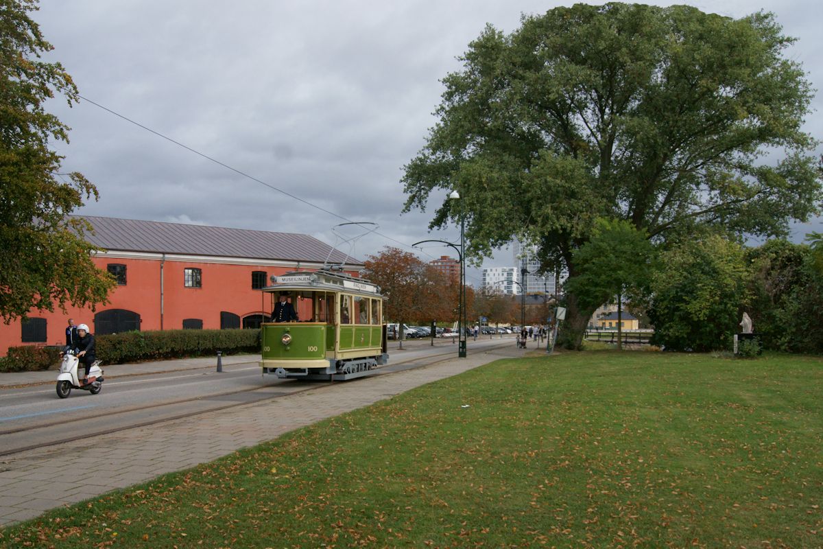 Am 02.10.2016 ist Triebwagen 20 der Museispårvägen Malmö (Museumsstraßenbahn Malmö) in Richtung Stadsbiblioteket unterwegs und gerade in den Kung Oscars väg eingebogen. Im Hintergrund ist der Turning Torso zu sehen.