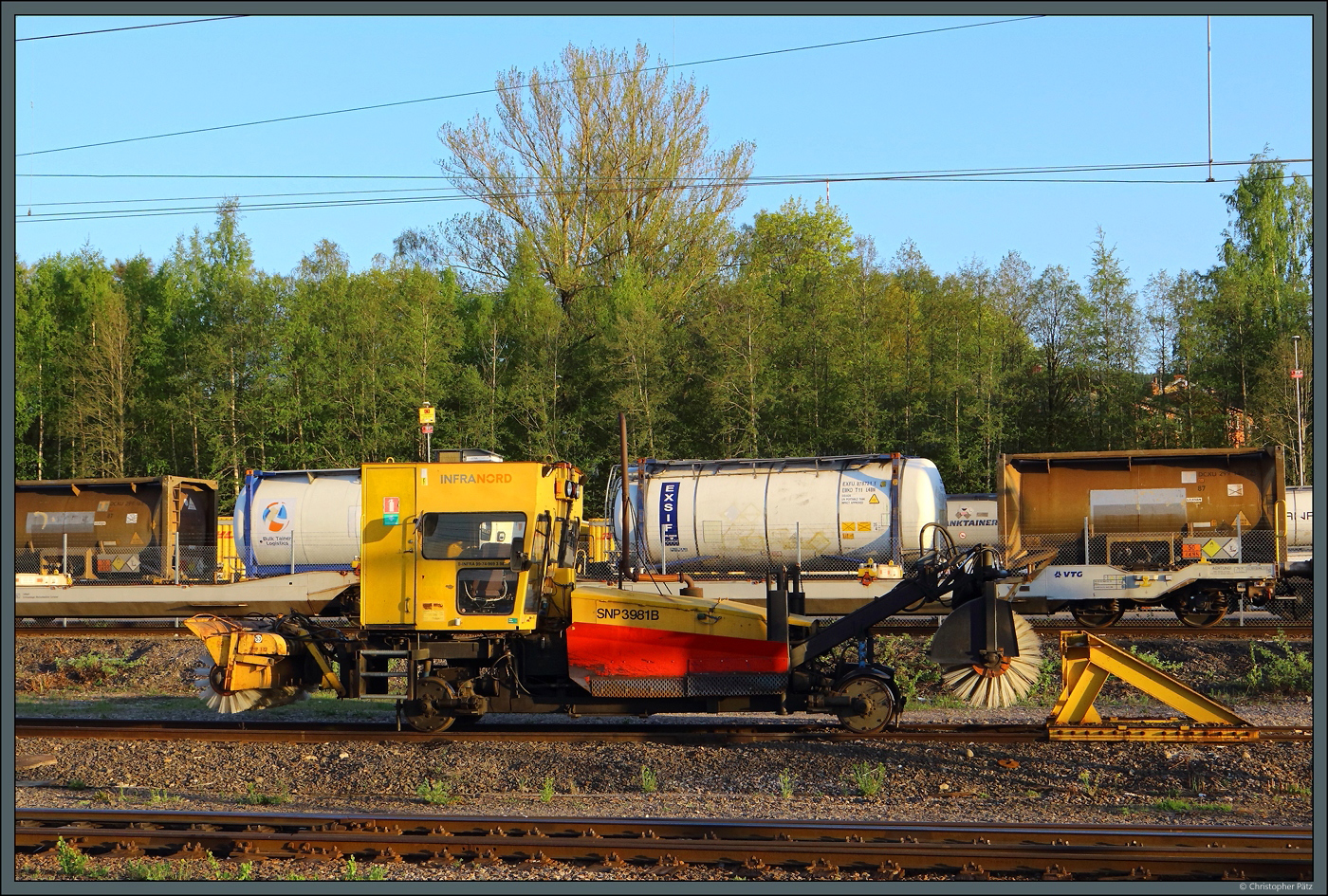 Im Bahnhof Sundsvall steht am 20.05.2023 die Schneekehrmaschine SNP 99-74-969 3 981-7 der Infranord. Das Nebenfahrzeug dient vor allem dem Kehren von Gleisen und Weichen, kann aber auch zur Gleisinspektion eingesetzt werden. Christopher Pätz