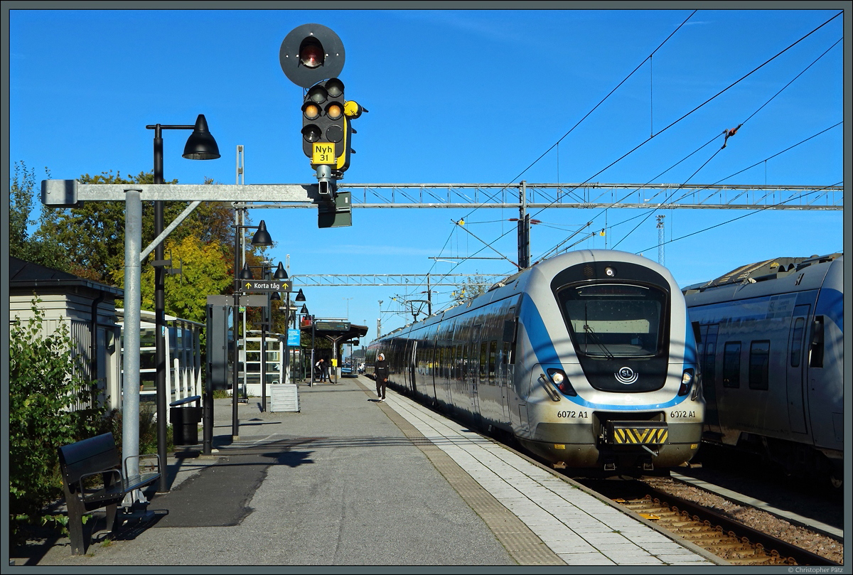 Als Pendeltåg 42X nach Stockholm steht der Coradia Nordic 6072 am 26.09.2021 im Bahnhof Nynäshamn.