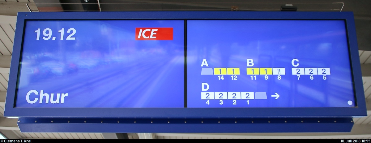 Kunden Informations Systeme für den Glacier Express im Bahnhof Disentis/Muster am 28. Juni 2018.