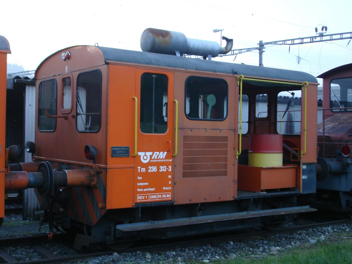 Der BLS-Tm 236 313-3 (ehemals RM/EBT-Tm 2/2 13, Baujahr 1972) am 28. Oktober 2007 noch mit RM-Beschriftung bei der Werkstätte Oberburg. Die Lichtverhältnisse waren für meine damalige Kamera etwas schwierig. Das Bild ist vom Feld hinter der Werkstätte aus aufgenommen worden. Urs Aeschlimann