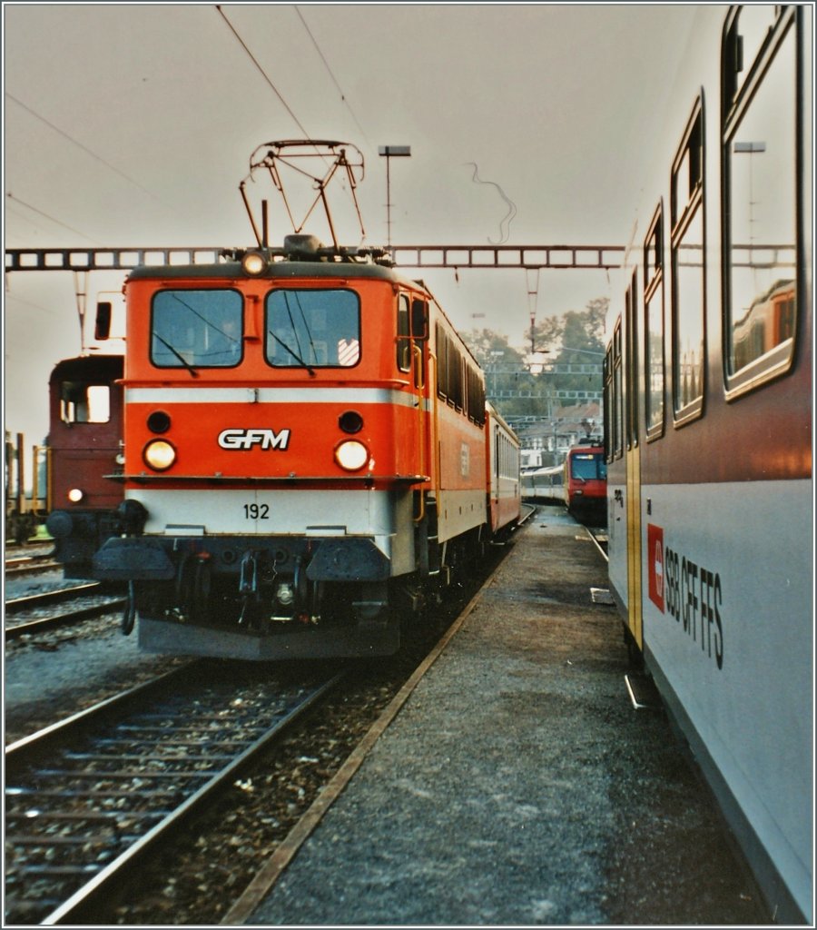 Die GFM Ae 477 in Romont. Der Zug wurde von der GFM auf der Strecke Romont - Bulle eingesetzt, welche damals eine recht "dünnen" Fahrplan Aufweis. Heute (2023) fährt hier die TPF im Halbstundentakt als S-Bahn, teils mit Zugläufen Bern - Broc.