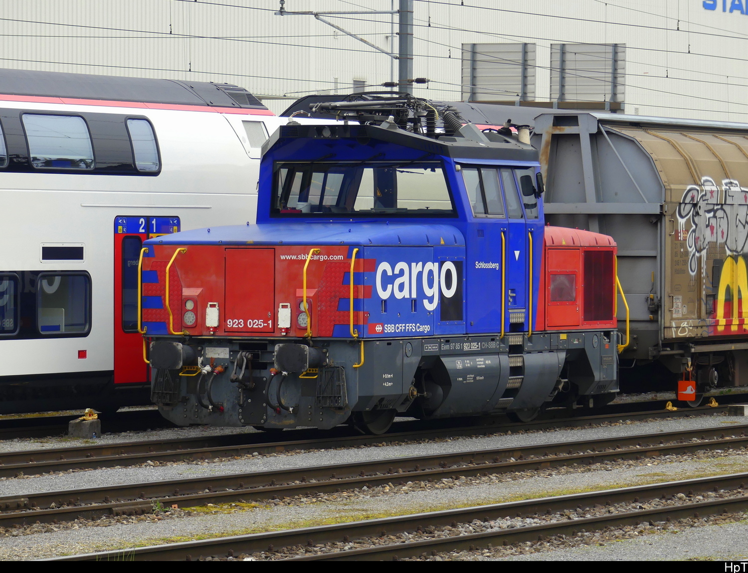 Die Rangierlok Eem 923 004 "Roggen" (97 85 1 923 004-6 CH-SBBC) steht abgestellt vor dem Güterschuppen in Gossau SG.