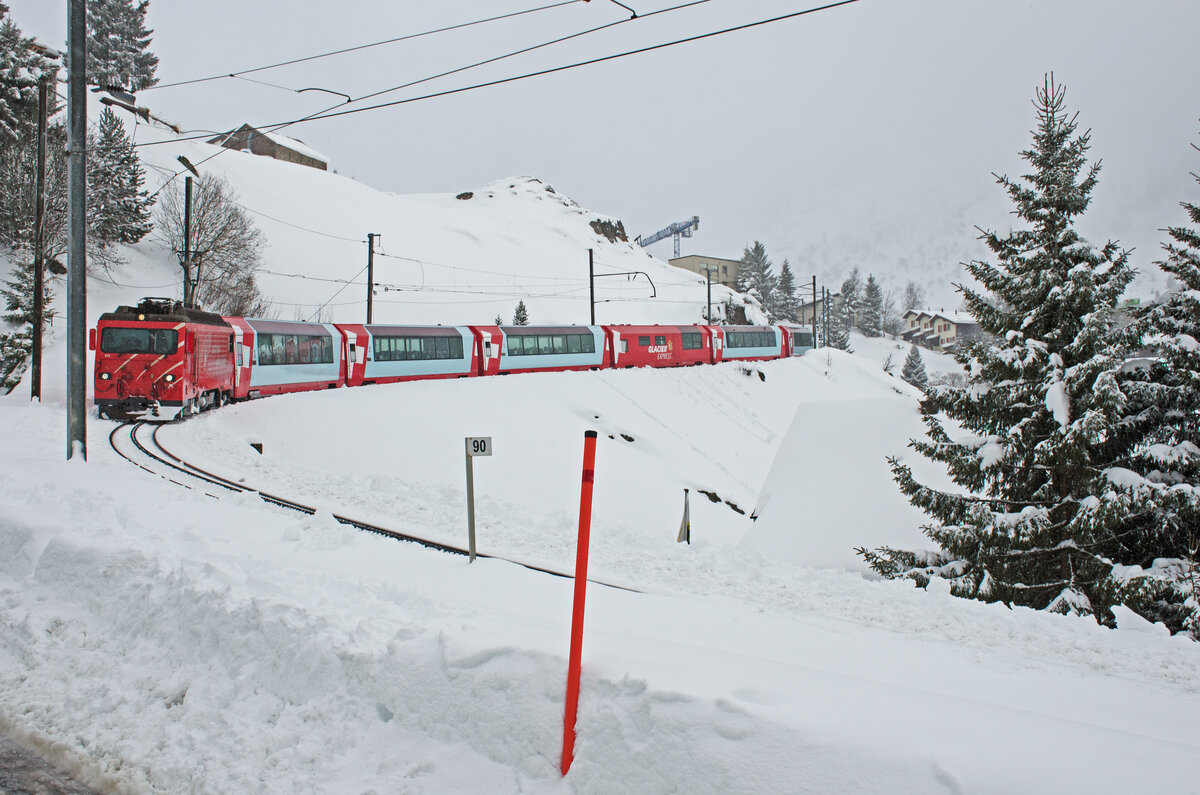 Freitag den 20.02.2026 um 13:59 Uhr in Andermatt (UR). Aus Richtung Oberalppass kommt soeben ein Glacier Express gefahren. Er befindet sich unmittelbar vor der Einfahrt zum Meterspur MGB (Matterhorn Gotthard Bahn) Bahnhof Andermatt. Dieser Zug verkehrt als PEGEX mit der Zugnummer 903 von St. Moritz (GR) Abfahrt um 08:38 Uhr nach Zermatt (VS) Ankunft um 17:07 Uhr. In Andermatt hat dieser Zug einen Aufenthalt von 13:58 Uhr bis 14:08 Uhr. Der Zug besteht aus folgendem Rollmaterial; Lokomotive: MGB HGe 4/4 II Nr. 103 mit dem Wappen der Stadt Chur (Marcau da Cuera), Wagen: 1. Wagen 2. Kl. Nr. 26 = RhB Bp 2535, 2. Wagen 2. Kl. Nr. 25 = MGB Bp 4067, 3. Wagen 1. Kl. Nr. 24 = MGB Ap 4043, 4. Wagen Speisewagen (Nr. 23) = MGB WRp 3833, 5. Wagen 1. Klasse Nr. 22 = MGB Api 4040, 6. Wagen Excellence Class Nr. 21 = MGB Aps 4046. Koordinaten GMS (Grad, Minuten, Sekunden): N 46° 38’ 15.9’’ O 8° 35’ 45.5’’