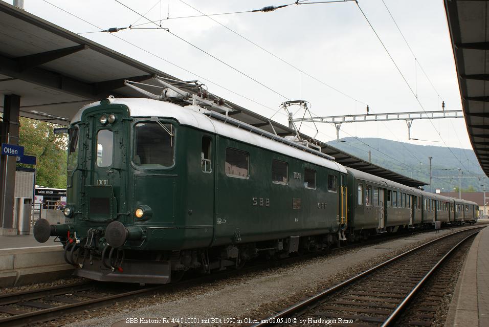 SBB Historic Re 4/4 I 10001 mit dem aus Leichtstahl-Wagen und dem BDt 1990 gebildeten Pendelzug, der zwischen dem Festgelände im Depot Olten und dem Bahnhof Olten pendelte.