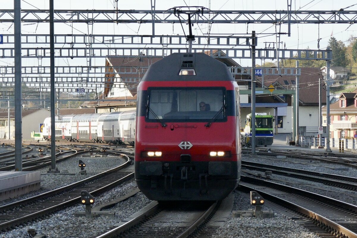 Die Re 460 076 "Leventina" mit dem IC 8 am 30.10.22 bei der Einfahrt in Spiez.