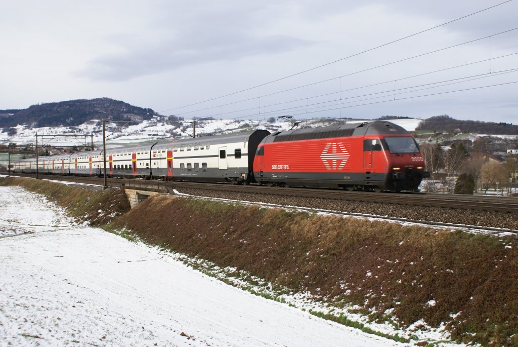 Re 460 088-0 verlässt am 22.12.09 Frick mit einem IC 2000-Pendelzug, allerdings nur mit einem EW IV-Steuerwagen am Schluss.