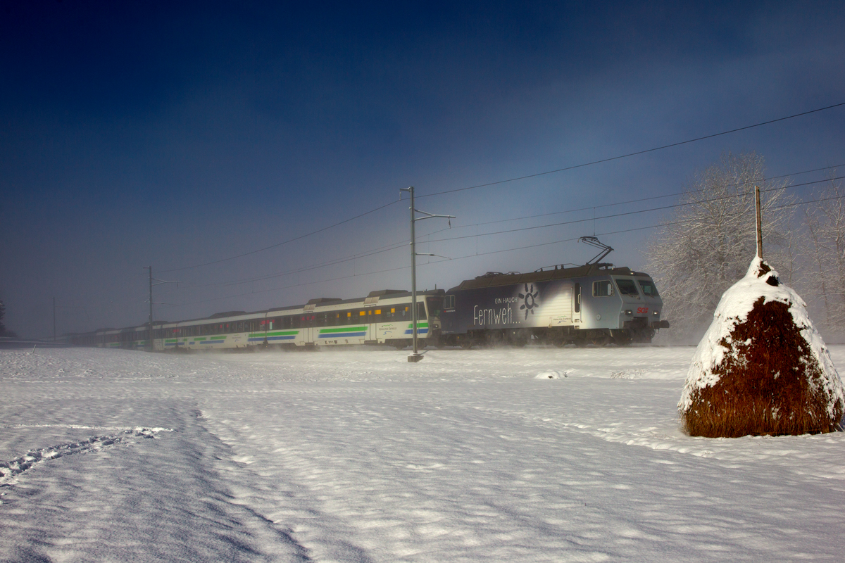 Bei Altmatt bildet sich ein Nebelbogen als die Re 446 017 schiebend am Voralpenexpress vorüberfährt.Bild vom 24.2.2016