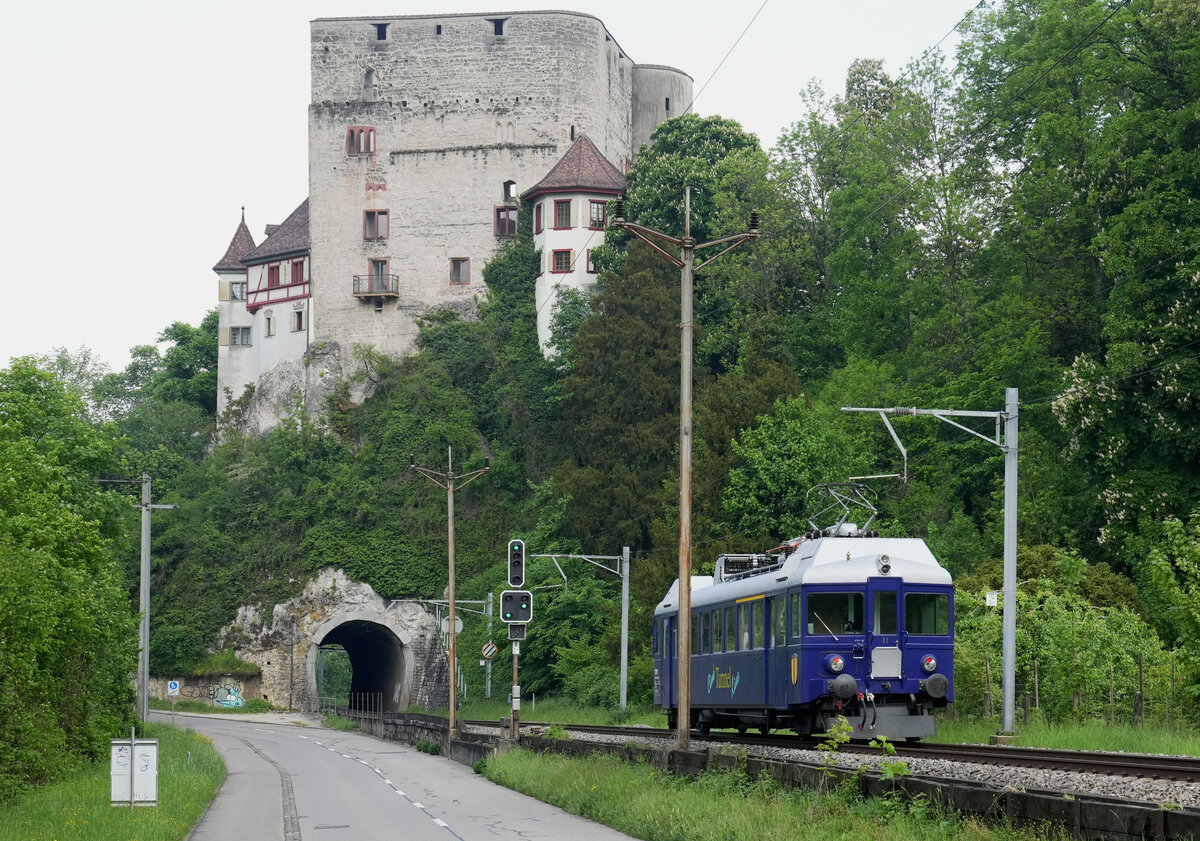 Auch ausserhalb der heimischen Geleise durch den Weissenstein-Tunnel passierte der ABe 526 290-2, ehemals SOB, vom Tunnelkino auf der Sonderfahrt nach Full zum Depotfest einen nur kleinen Tunnel bei der Ruine Pfeffingen am 7. Mai 2022.