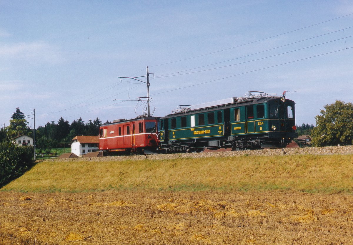 Regionalverkehr Bern Solothurn/RBS. SZB-Erinnerungen aus dem Jahre 1993. De 4/4 103 mit CFe 4/4 11 "HOSCHTET SCHNÄGG" auf gemeinsamer Fahrt im Limpachtal bei Kräiligen. Nach der Ausrangierung wurde der Gütertriebwagen De 4/4 103 verschrottet. Foto: Walter Ruetsch