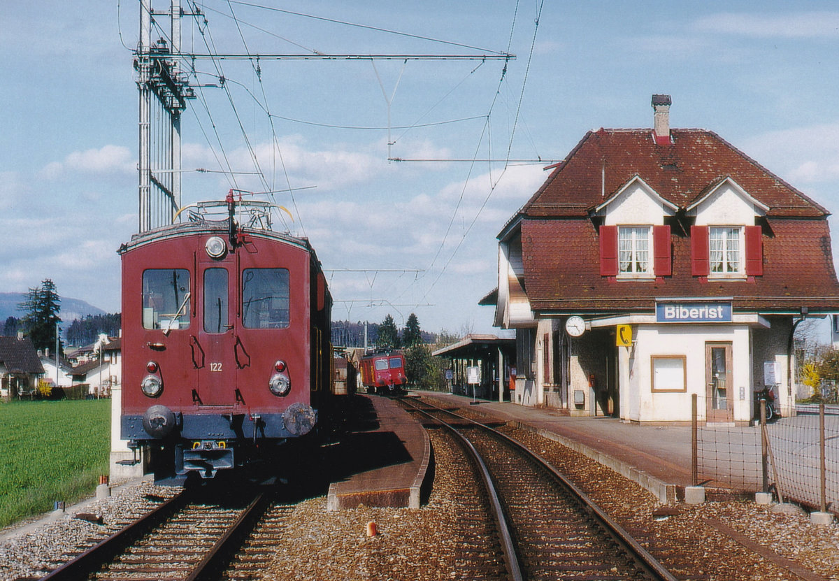 Regionalverkehr Bern Solothurn/RBS. SZB-Erinnerungen aus dem Jahre 1993. Gem 4/4 122 und De 4/4 101 anlässlich einer seltenen Begegnung auf dem Bahnhof Biberist. Nach der Ausrangierung wurde der De 4/4 101 abgebrochen. Der Gem 4/4 122 hat die Museumsbahn La Traction übernommen. Foto: Walter Ruetsch