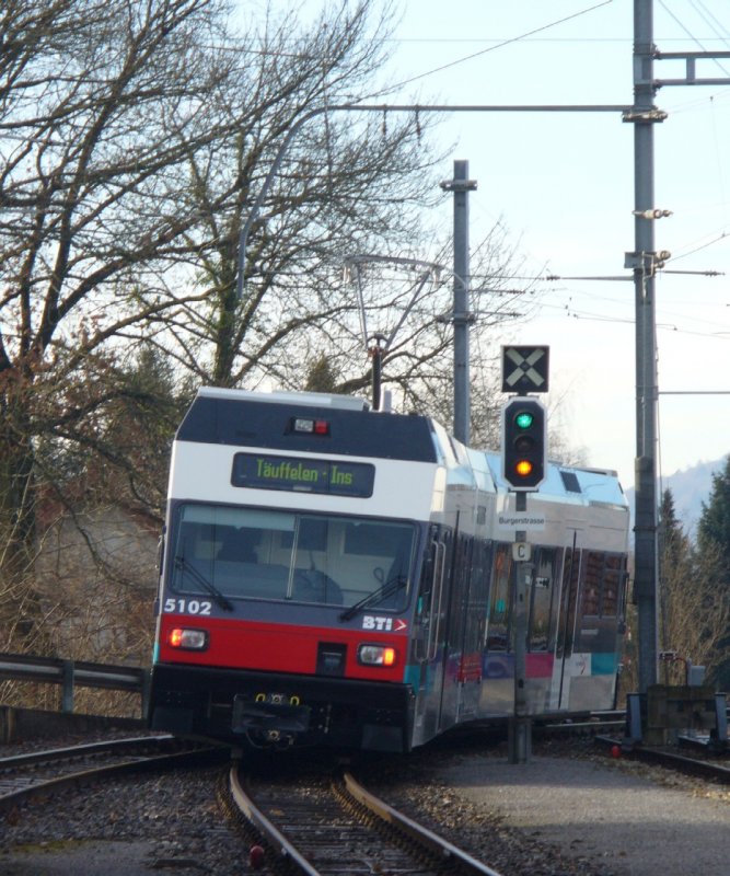 BTI / asm - Triebwagen Be 2/6 510 bei seiner erster Fahrt mit Fahrgästen als Zug 7050 von Biel nach Ins. Hier bei der Ausfahrt aus dem Bahnhof von Täuffelen am 11.01.2007