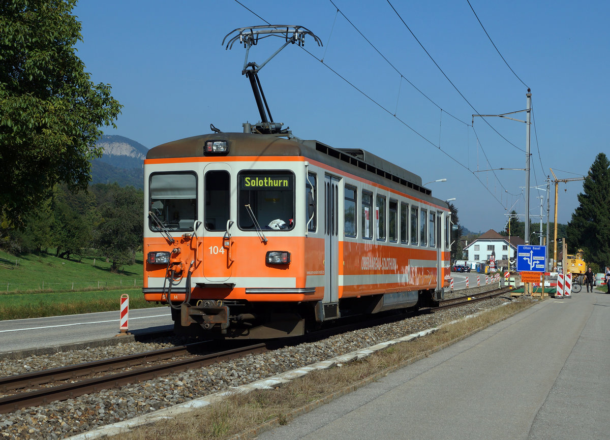 ASm: Regionalzug mit Be 4/4 104 (ehemals SZB/BTI) bei Flumenthal am 24. September 2016.