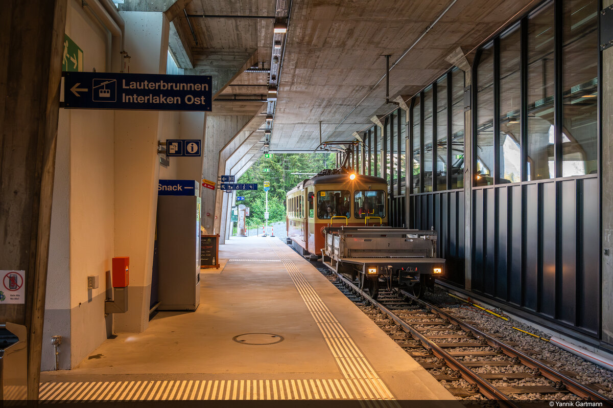 Am 24.06.2023 fährt ein BLM Be 4/4 in die bereits modenisierte Station Grütschalp ein. In wenigen Momenten wird eine grosse Ladung an Touristen in die Gondelbahn in Richtung Lauterbrunnen umsteigen und ihre Heim- oder Weiterreise antreten