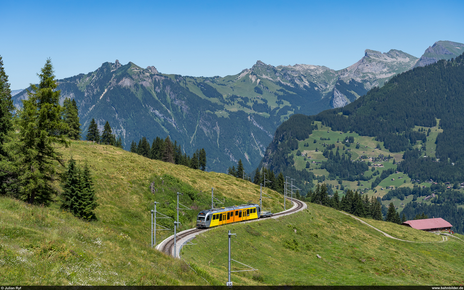 Während der erste Zugteil unterwegs auf die Winteregg ist und die Kräne zum abladen benötigt werden, hat man am 13.5.24 den zweiten Zugteil abgeladen und zwischenzeitlich auf den Bahnhofplatz Lauterbrunnen gestellt.