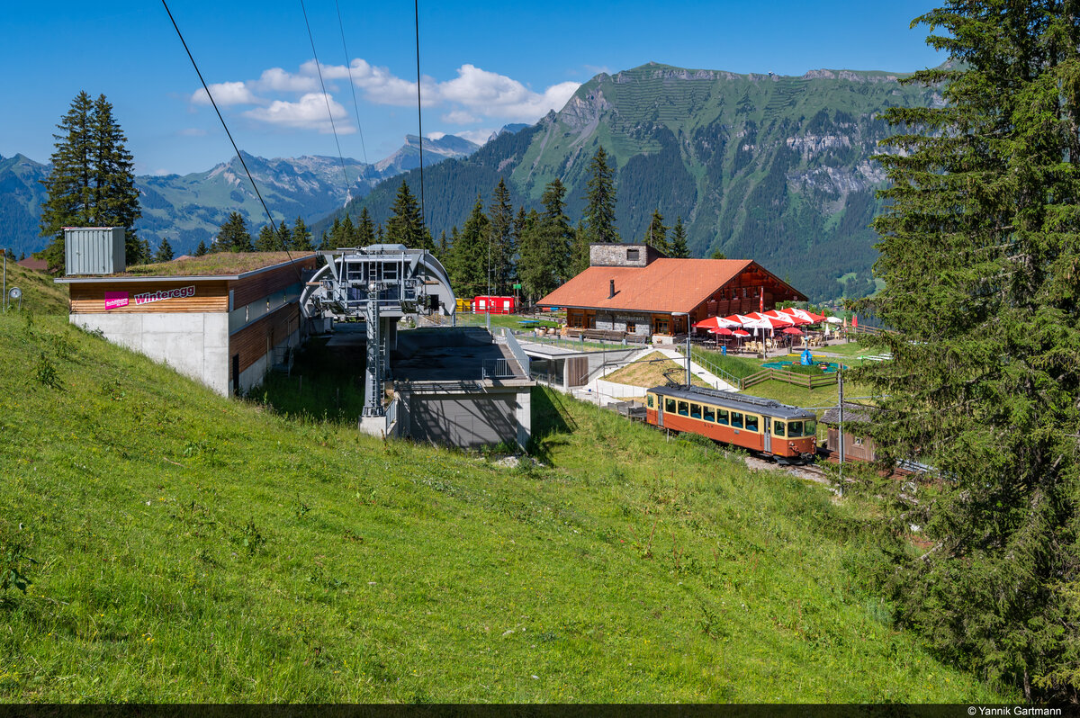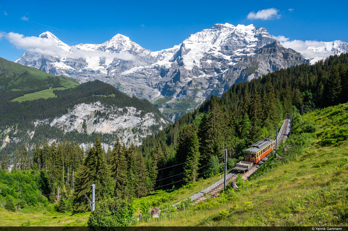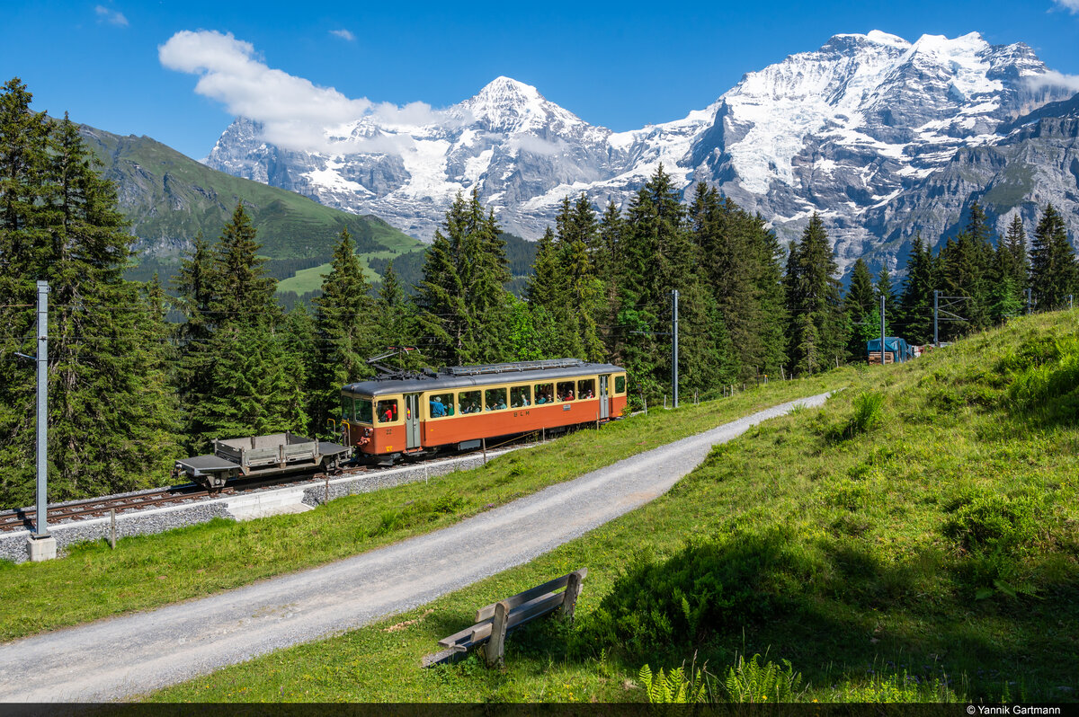 BLM Be 4/4 22 überquert soeben die Staubbachbrücke zwischen Winteregg und Grütschalp. Im Hintergrund das Jungfraujoch und die Jungfrau.(18.08.2012)