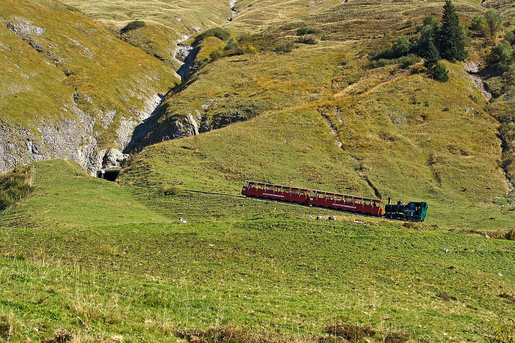 Die Heizöl befeuerte BRB 14 (Gemeinde Brienz) fährt zum Brienzer Rothorn hinauf, hier am 01.10.2011 kurz vor der Einfahrt in den Kühmatt-Tunnel.