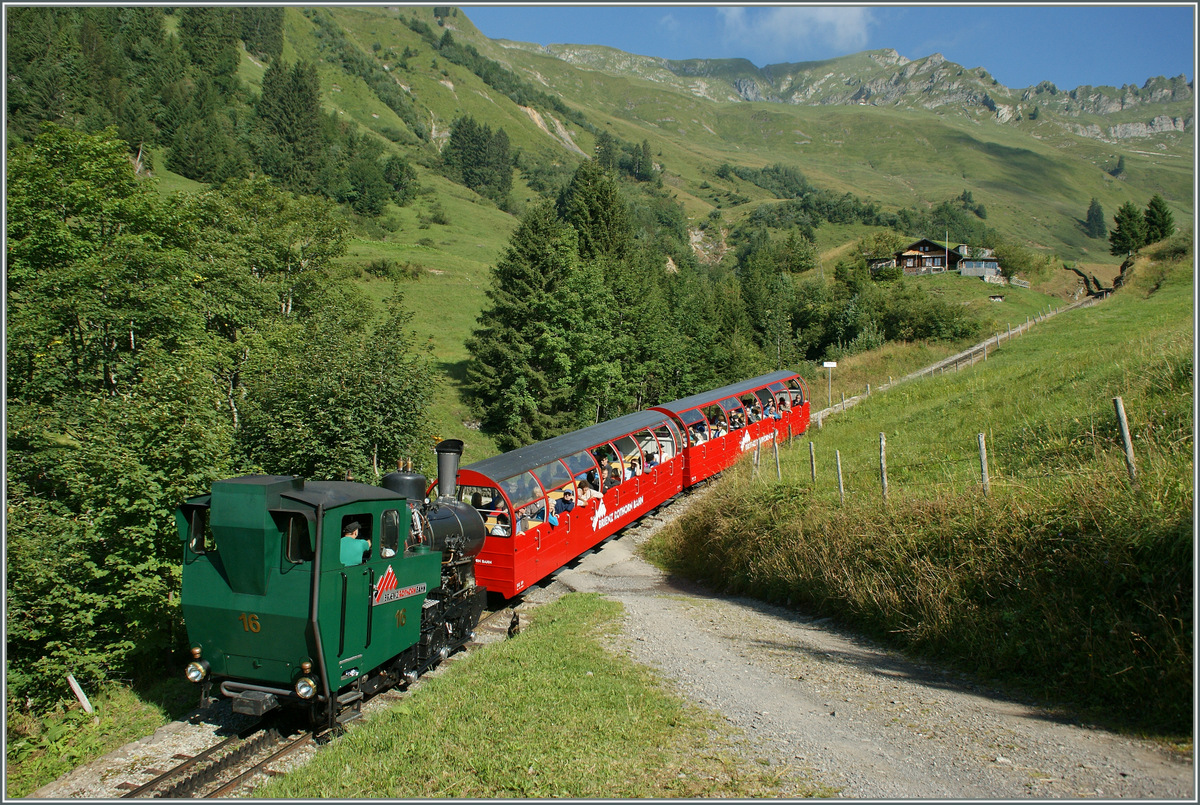 Die H 2/3 N°16 hat auf der Planalp 1000 Liter Wasser bekommen und hat nach der Kreuzung mit dem Gegenzug nun freie Fahrt Richtung Brienzer Rothorn.