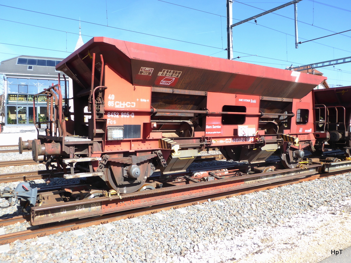CJ - Beladener Rollschemmel Ua 264 mit dem Schotterwagen FCS 40 85 645 2 905-0 im Bahnhofsareal von Le Noirmont am 11.03.2017