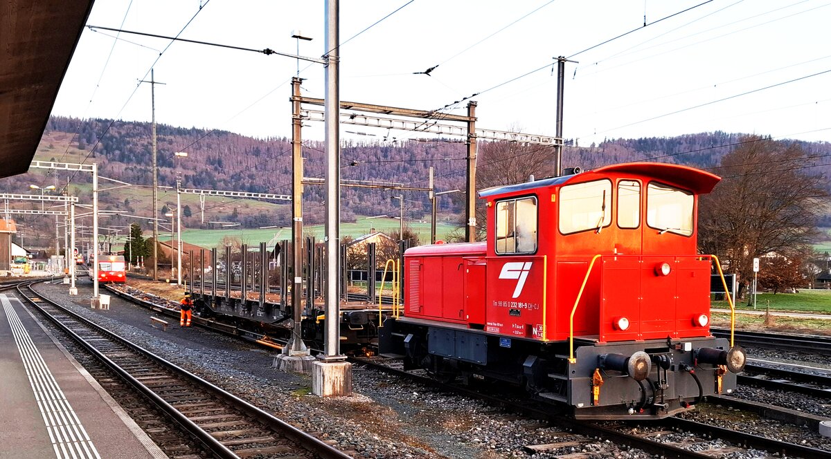CJ Bf Glovelier__Links liefert der Lkw Holz zum Verladen auf die SBB, daneben CJ-Tw mit N-Spur-Flachwagen auf M-Spur-Rollwagen, rechts davon abfahrbereiter Müllcontainer-Zug und ganz rechts die CJ Rangierlok Tm 232 181-9.__27-02-2026