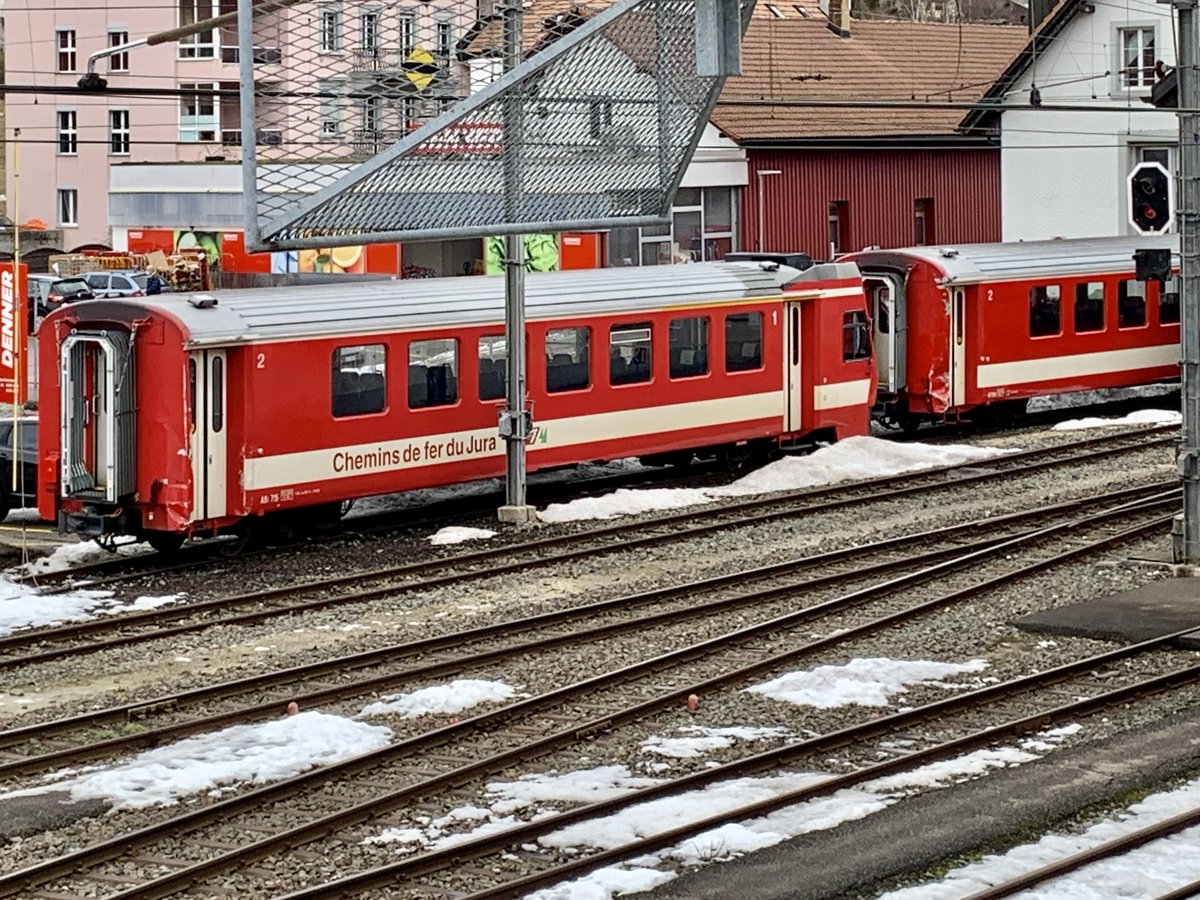 Der ABt 715 und B 755 der CJ die mitte Januar bei einer Kollision mit einem Bus beschädigt wurden, am 29.1.21 im Tramelan abgestellt.