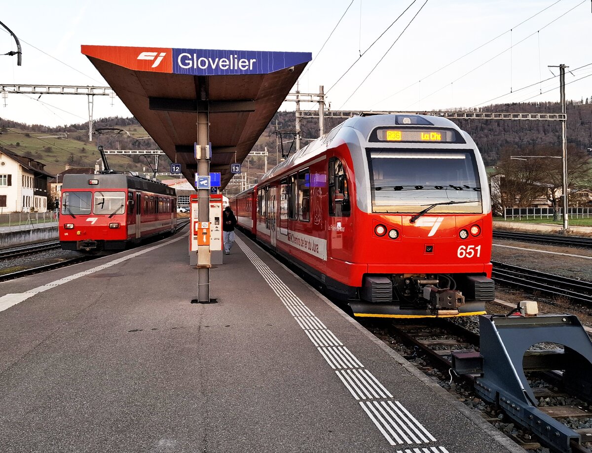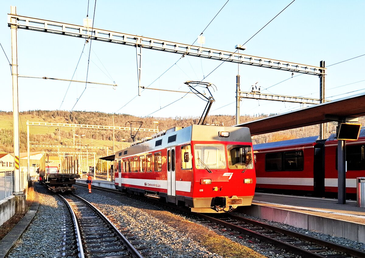 CJ Bf Glovelier__Alt-Tw Be 4/4 616 (ex Frauenfeld-Wiel-Bahn) wartet auf den nächsten Einsatz als G-Zug-'Lok'. Auf dem linken Gleis ein anderer Tw mit N-Spur-Rungenwagen auf Rollwagen.__27-02-2026