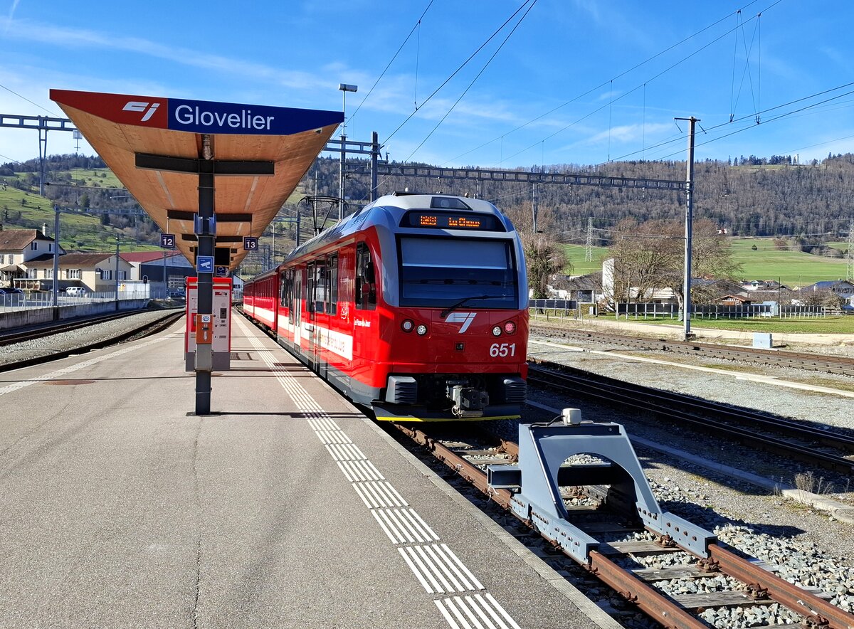CJ Bf Glovelier__Tw 651 [Be 4/4; Stadler 2016] mit zwei 4x Wagen im Banhnhof Glovelier.__25-02-2026