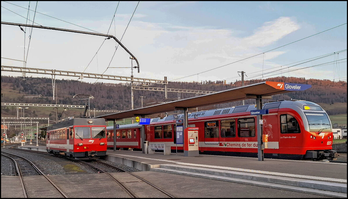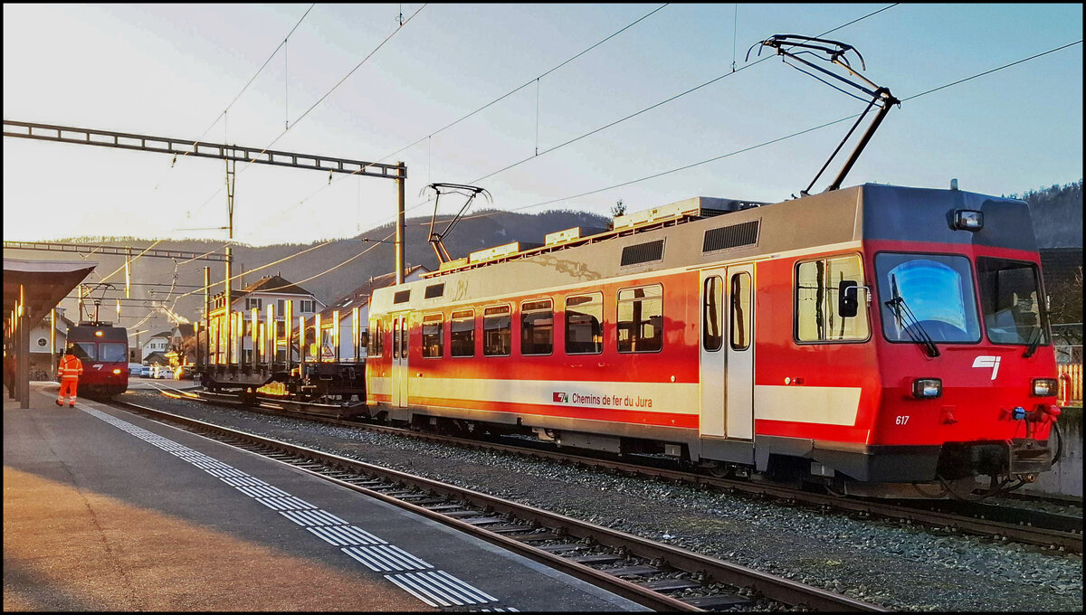 Aus Richtung Glovelier nähert sich der ABe 2/6 632 am 12.1.12 Le Noirmont.