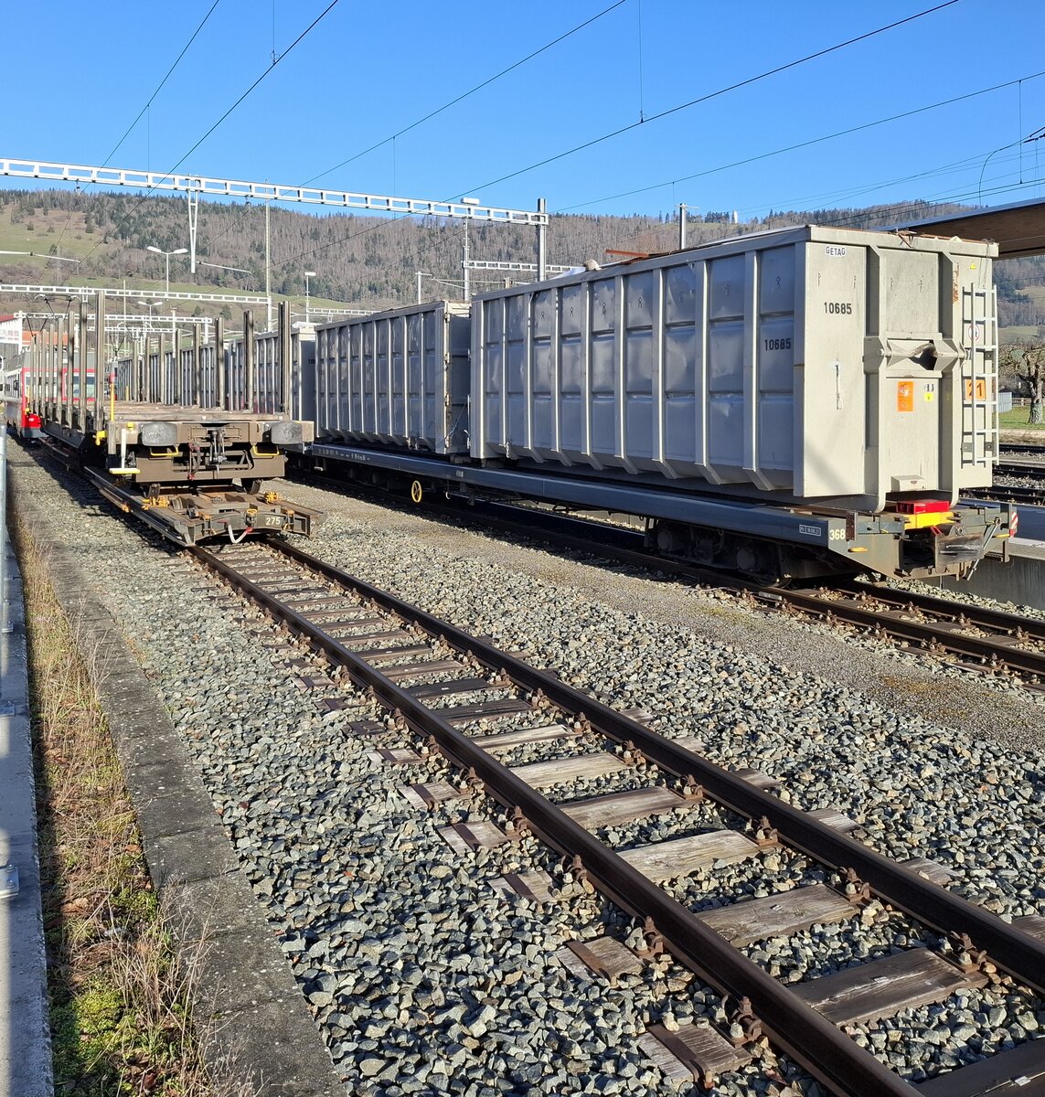 CJ Bf Glovelier__Während der Linienzug von La Chaux-de-Fonds mit ABe 4/12 671 einfährt wird ein N-Spur-Rungenwagen zum Holztransport auf die M-Spur Rollschemel der CJ gedrückt. Als 'Zuglok' für den Rollschemel-Zug nach Saignelégier dient üblicherweise ein älterer Personen-Tw so wie hier Be 4/4 617 (ex Frauenfeld-Wiel-Bahn).__27-02-2026