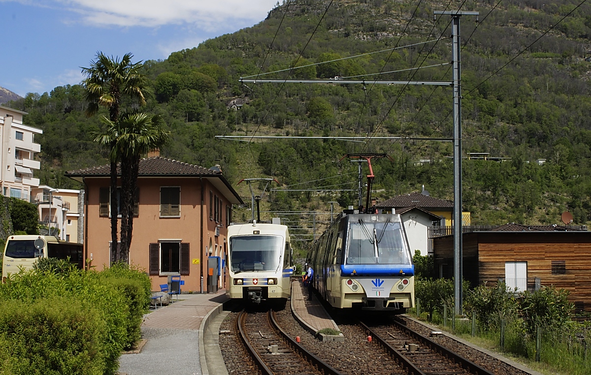 Am 07.05.2019 treffen sich der ABe 4/8 47 der FART und ein Panoramazug der SSIF im Bahnhof Intragna