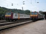 Zugbegegnung bei Camedo auf der Strecke der Centovallibahn (FART). 02.08.07