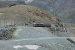 Am 10.05.2024 hat ein Be 4/6-Doppel die Bergstation am Gornergrat verlassen und ist auf dem Weg in das 1404 m tiefer gelegene Zermatt