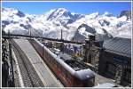 Gleisende auf 3089m in der Station Gornergrat mit Panoramablick auf das Monte Rosa Massiv mit Signalkuppe 4554m, Liskamm 4479m, die Zwillinge Castor 4223m und Pollux 4092m. (05.08.2013)