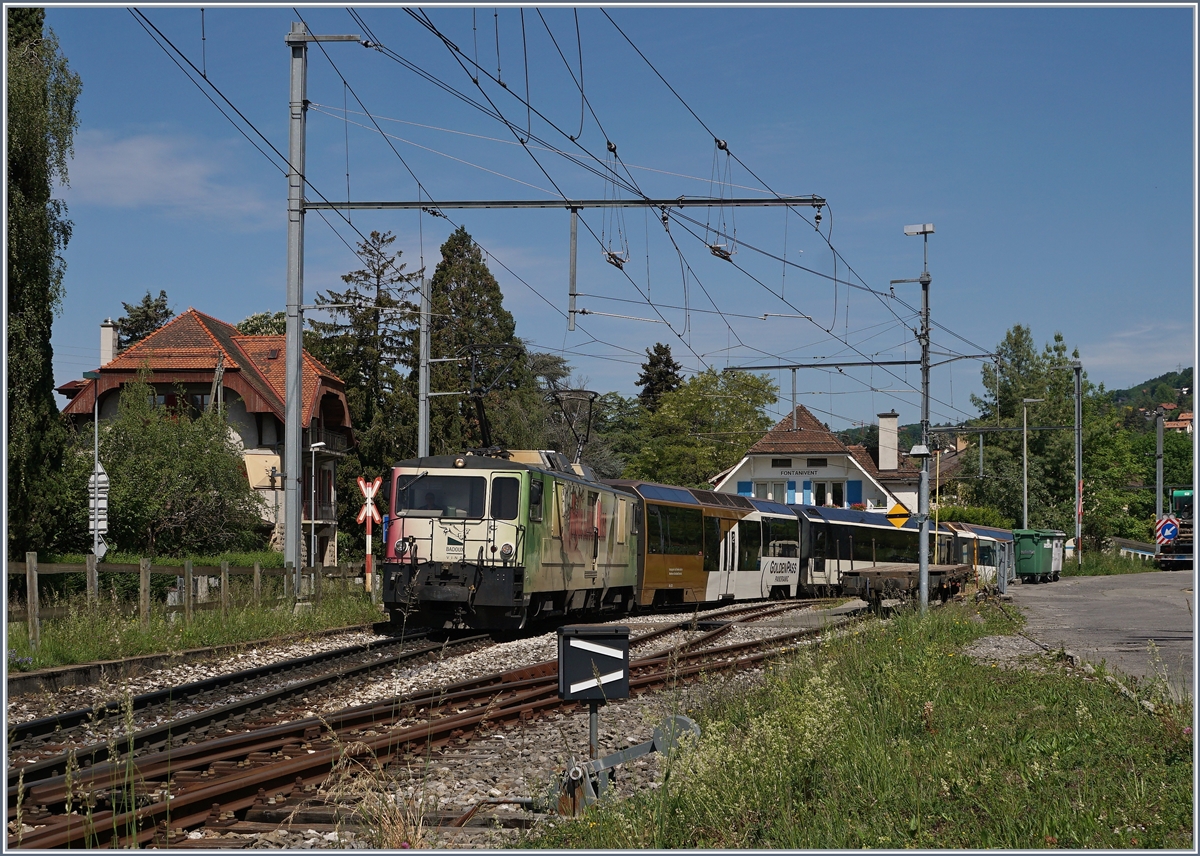 Die MOB GDe 4/4 6006 "Aigles les Murailles" fährt mit ihrem PE 2122 auf dem Weg von Monteux nach Zweisimmen in Fontanivent durch.